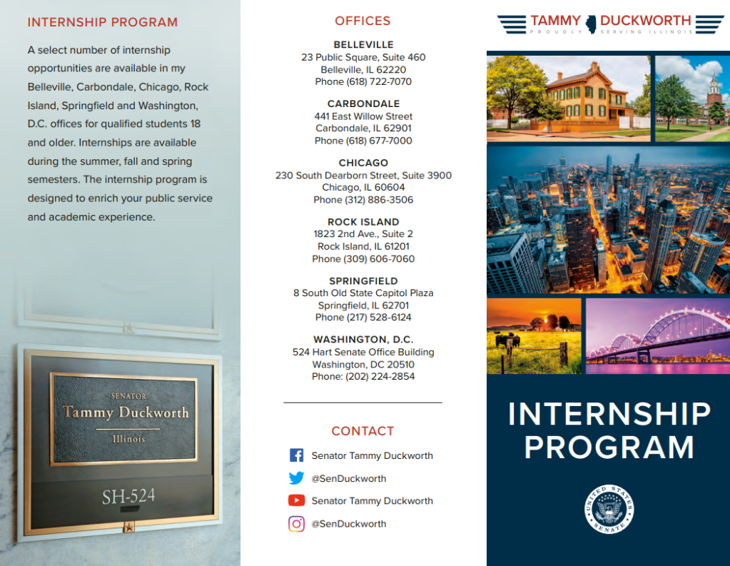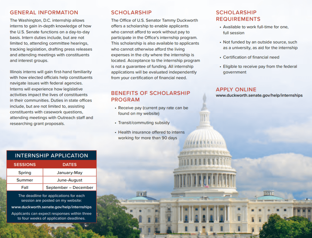 More information about the Internship and Scholarship Programs can be found on the website at: https://www.duckworth.senate.gov/help/internships.